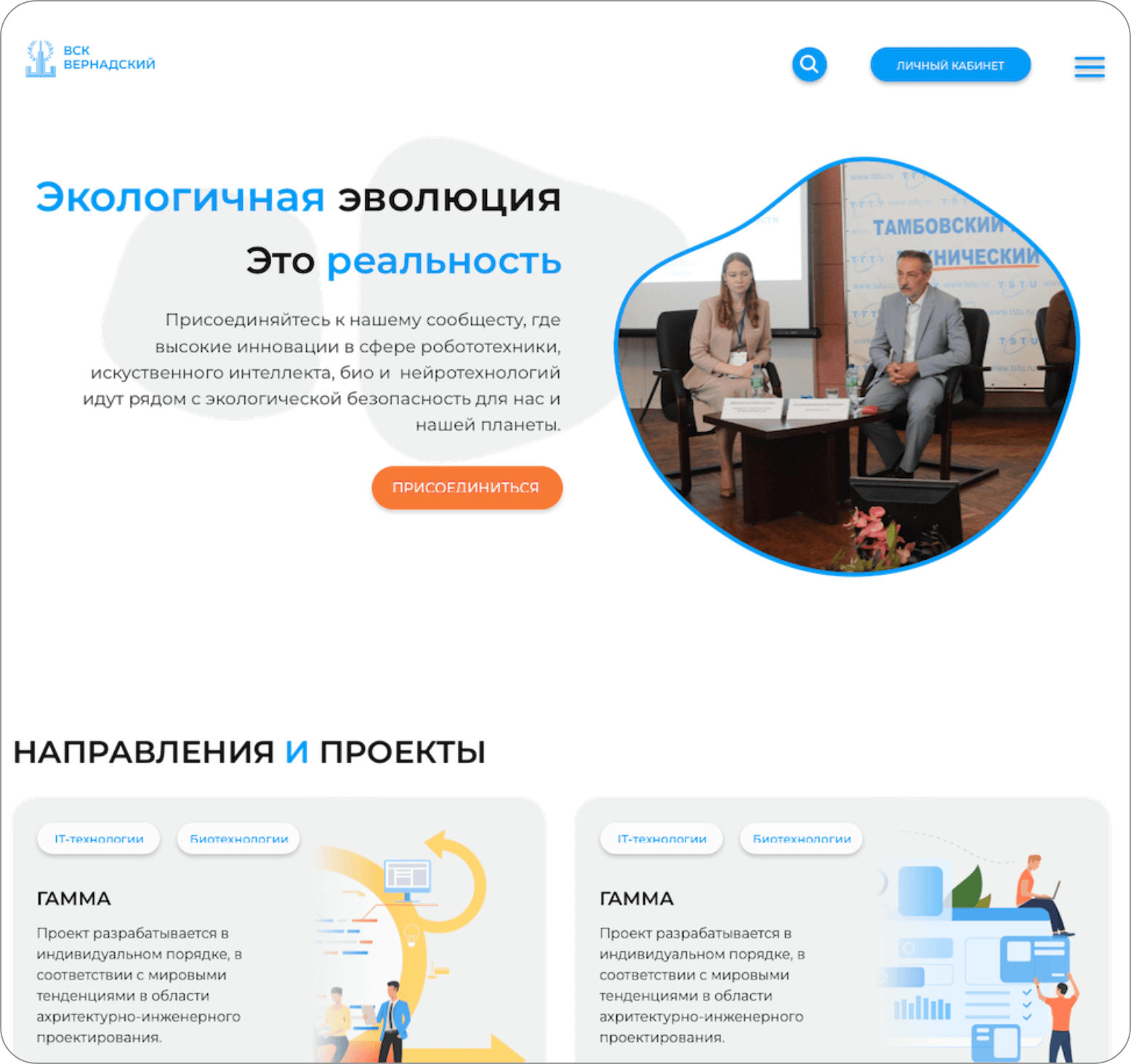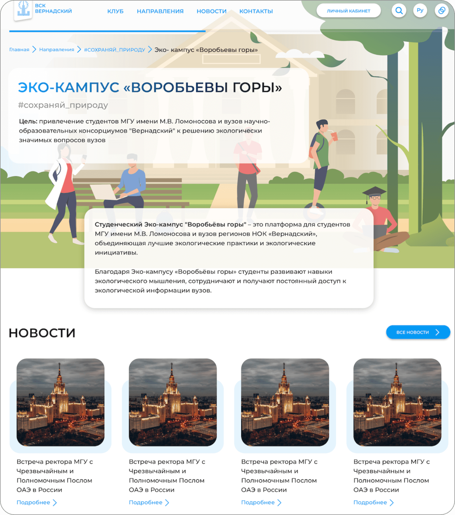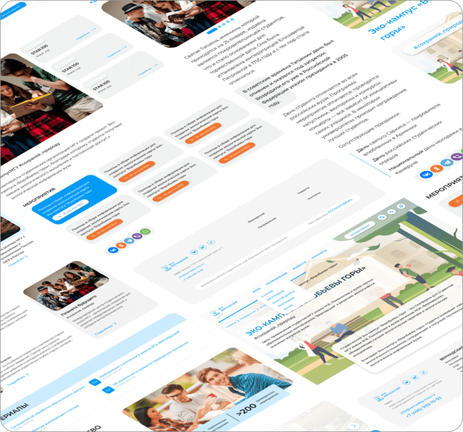 Проект создан для развития студенческих сообществ, поэтому для дизайна были выбраны сочные цветовые решения на основе оранжевых, ярко-синих, зеленых оттенков.